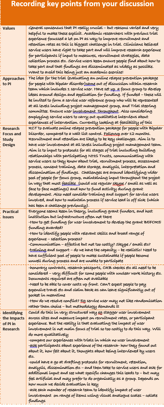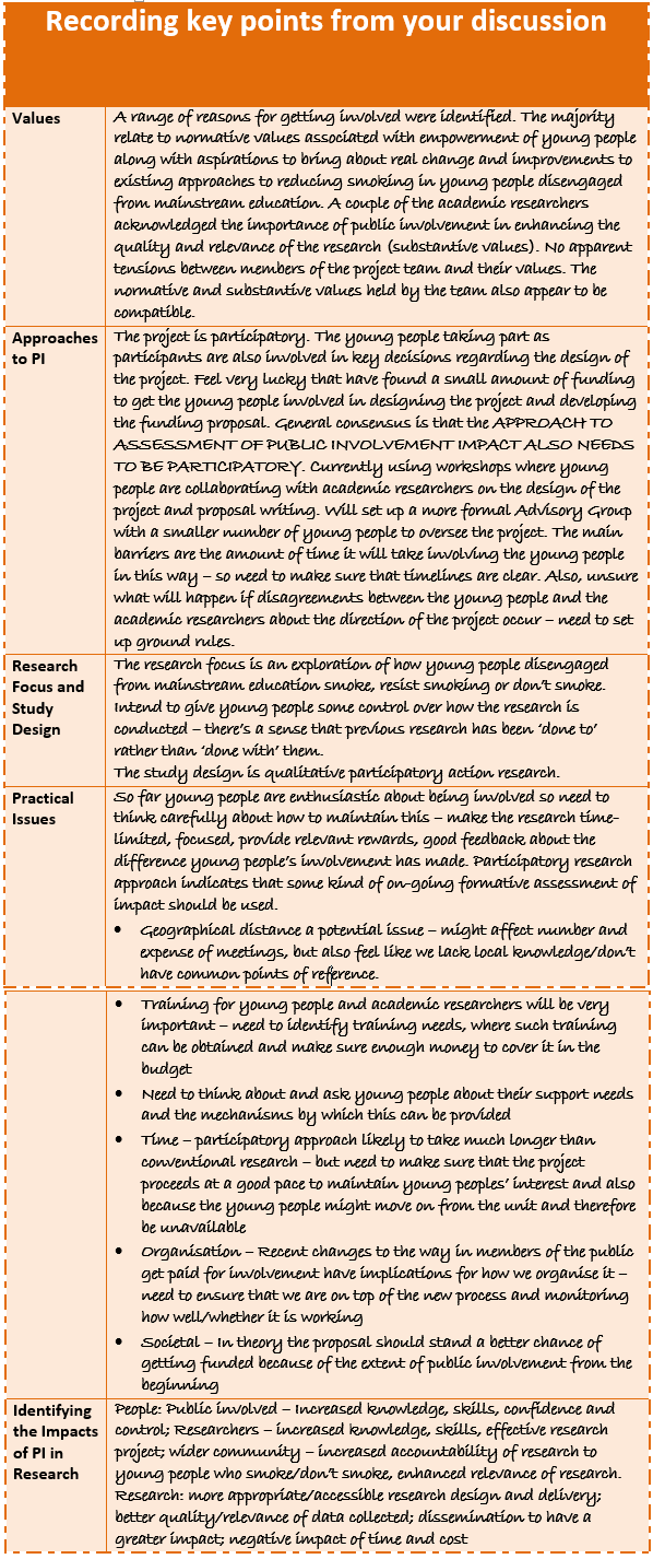 As you work through Part 1 of the PiiAF you are invited to consider the implications of the five elements for the impact of public involvement in your research. You might find it helpful to record your discussions using this record card. The information you record will provide useful building blocks in Part 2 as you develop your impact assessment plan.